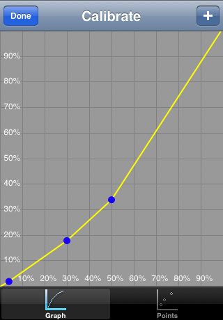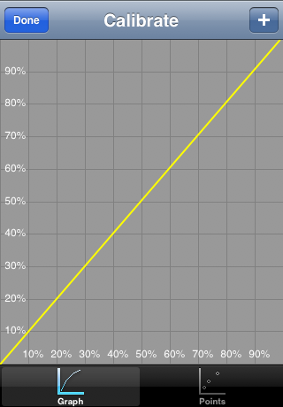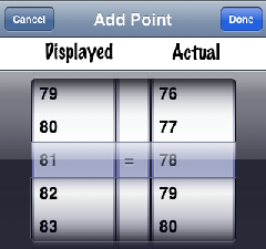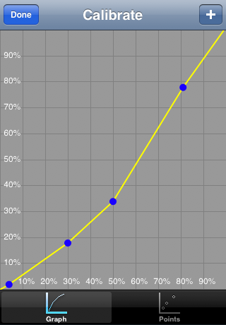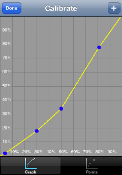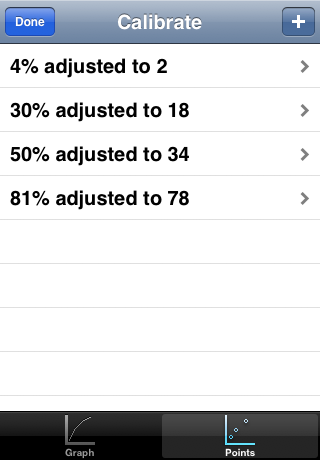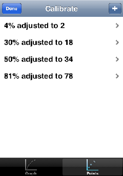 The reference tint used here is 78% VLT. Note that the display reads 74% with the brightness reading of 81%. This is due to previous values entered. To add a new point, select the '+' on the menu bar. This will bring up the add view. Choose the Displayed value of 81, and the Actual value to 78, and select Done.With the new point, the curve will be adjusted. You can display the point values by choosing the Point tab on the bottom. This will allow you to edit or delete points.